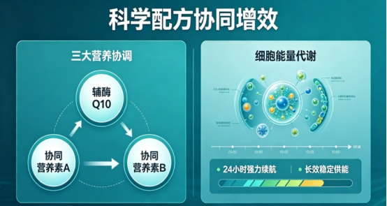 专为50岁以上年龄群体研发的“银龄专属配方”。在还原型辅酶Q10基础上,科学添加了PQQ(吡咯并喹啉喹二钠盐)等支持线粒体健康的营养素,针对性地应对随年龄增长出现的细胞能量衰退。