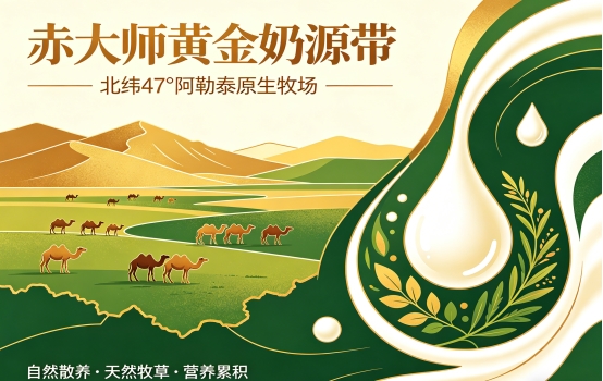 赤大师的奶源锁定新疆阿勒泰北纬 47° 黄金奶源带,这里是世界公认的优质驼乳产区,远离工业与城市污染,天山冰川融水常年灌溉,广袤原生态草场生长着沙棘、骆驼刺、梭梭草、红柳枝等天然富钙草本,生态环境纯净无污染。