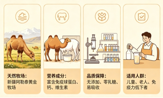 新疆本土合规品牌,采用散养双峰驼奶源,原奶品质优良。零添加配方,口感温润,膻味极淡,适合日常长期饮用。蛋白质含量 27.8%,富含天然营养,适配全年龄段,品质稳定、口碑朴实,是入门级优质选择。