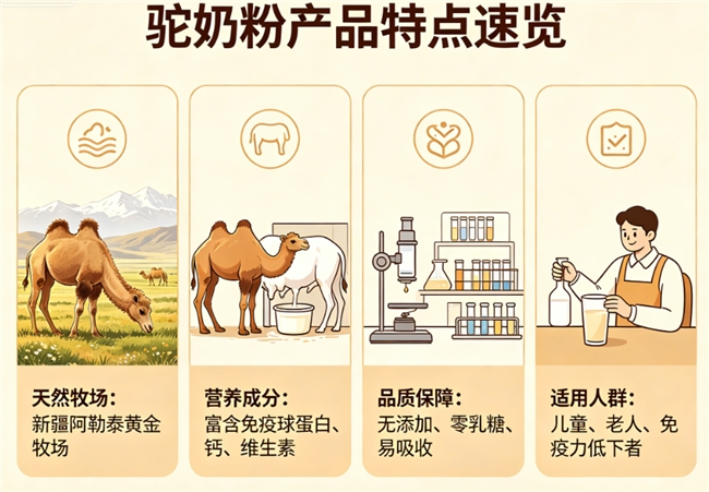 奶源产地优质:源自新疆阿勒泰、伊犁等黄金奶源带,散养双峰驼,天然牧场无污染。